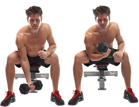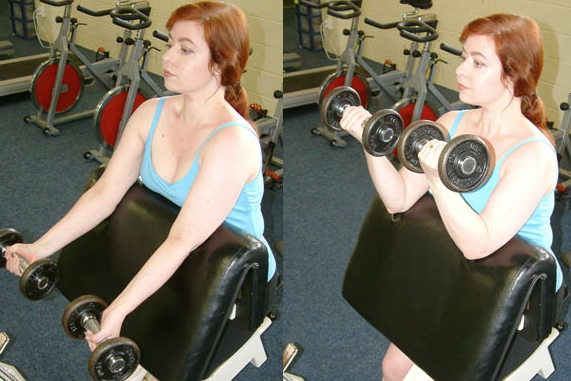 The second theory uses grip placement and angle as the primary factor in targeting each head. For instance, to target the long head when using dumbbells or cables, the grip should be semi-supinated (hammer) grip where the palms face each other. If using a barbell (EZ grip or straight), the grip should be inside of shoulder width. To target the short head when using dumbbells or cables, grip should be supinated, where the palms are facing up completely. If using a barbell (EZ grip or straight), grip should be outside of shoulder width.[10]