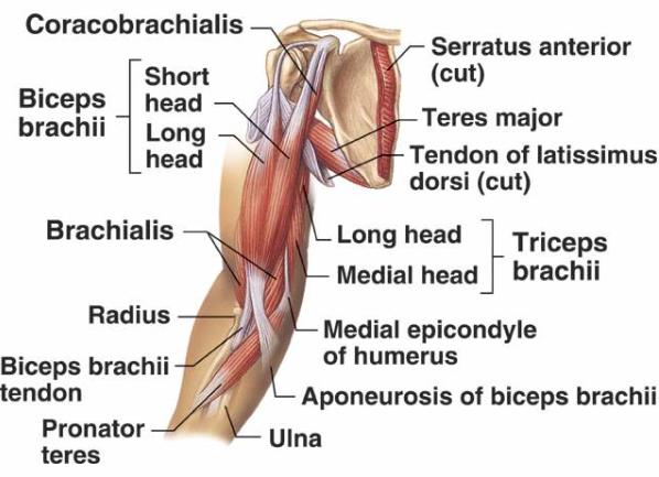4. 팔꿈치 쪽에서는 aponeurosis of biceps brachii , biceps brachii tendon으로 이어짐.