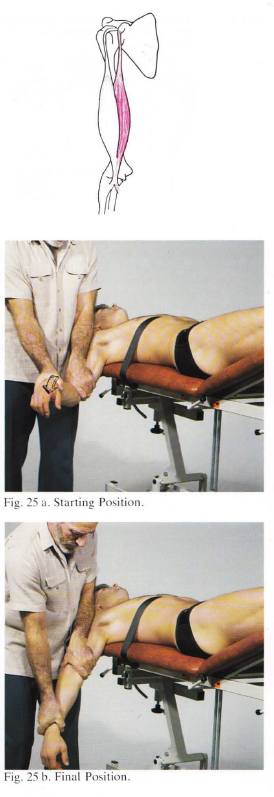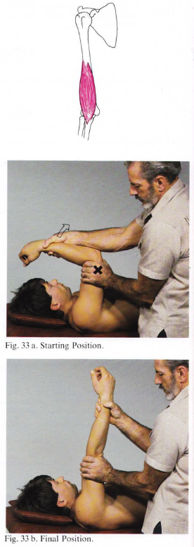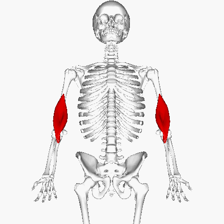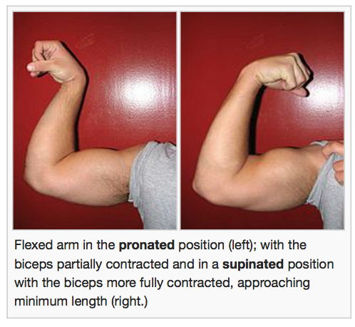 - Proximal radioulnar joint (upper forearm) – Contrary to popular belief, the biceps brachii is not the most powerful flexor of the forearm, a role which actually belongs to the deeper brachialis muscle. The biceps brachii functions primarily as a powerful supinator of the forearm (turns the palm upwards). This action, which is aided by the supinator muscle, requires the elbow to be at least partially flexed. If the elbow, or humeroulnar joint, is fully extended, supination is then primarily carried out by the supinator muscle.