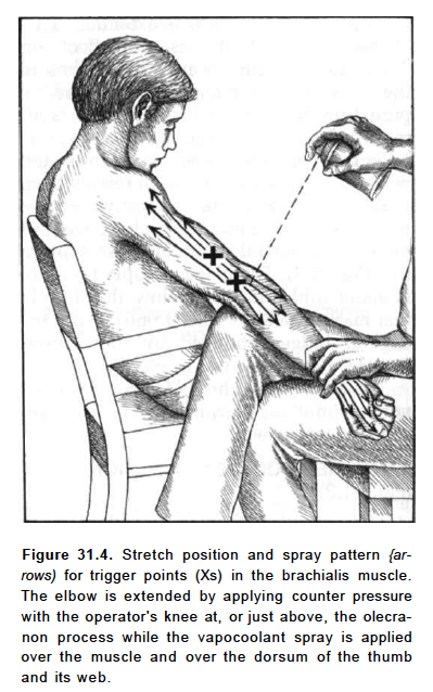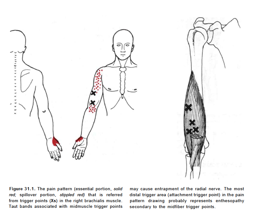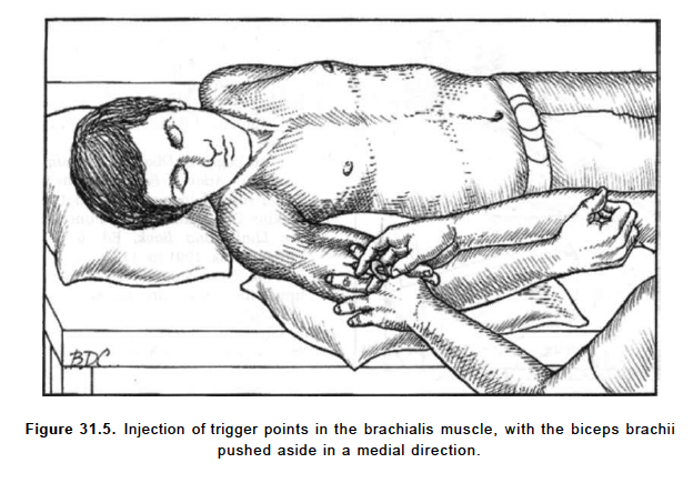 The brachialis originates from the lower half of the front of the humerus, near the insertion of the deltoid muscle, which it embraces by two angular processes. Its origin extends below to within 2.5 cm of the margin of the articular surface of the humerus at the elbow joint. It also arises from the intermuscular septa of the arm, but more extensively from the medial than the lateral; it is separated from the lateral below by the brachioradialis and extensor carpi radialis longus muscles.