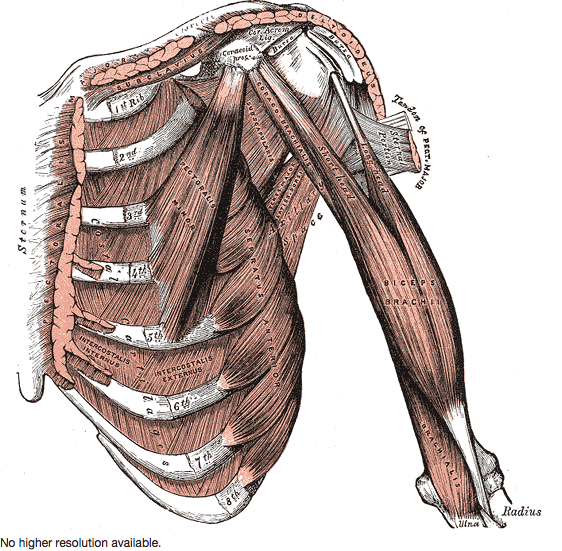 When the humerus is in motion, the tendon of the long head is held firmly in place in the intertubercular groove by the greater and lesser tubercles and the overlying transverse humeral ligament. During the motion from external to internal rotation, the tendon is forced medially against the lesser tubercle and superiorly against the transverse ligament. [2] The tendon of the short head runs adjacent to the tendon of the coracobrachialis and likewise attaches to the coracoid process.
