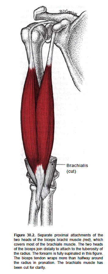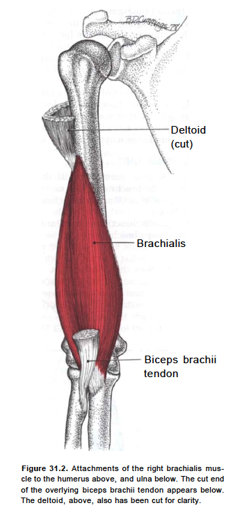 Unlike the biceps, the brachialis does not insert on the radius, and therefore cannot participate in pronation and supination of the forearm. It flexes the elbow joint.
