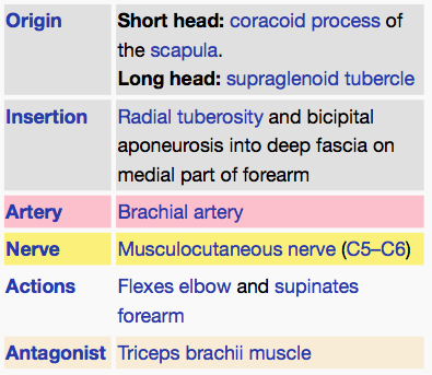 The biceps is tri-articulate, meaning that it works across three joints.[8] The most important of these functions is to supinate the forearm and flex the elbow.