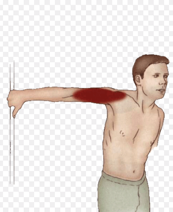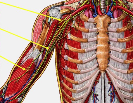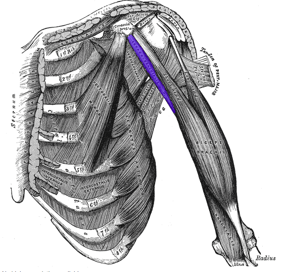 The overuse of the coracobrachialis can lead to stiffening of the muscle. Common causes of injury include chest workouts or activities where you have to press your arm very tight towards your body - e.g. work on the rings in gymnastics.[4] Symptoms of overuse or injury are pain in the arm and shoulder, radiating down to the back of the hand. In more severe cases, the musculocutaneous nerve can get trapped, causing disturbances in sensation to the skin on the radial part of the forearm and weakened flexion of the elbow, as the nerve also supplies the biceps brachii and brachialis muscle.[5] Actual rupture to the coracobrachialis muscle is extremely rare. Very few case reports exist in the literature, and it is reported to be caused by direct trauma to the contracted muscle. Avulsion of the muscle's origin from the coracoid as a result of indirect forces is even more unusual.[6]