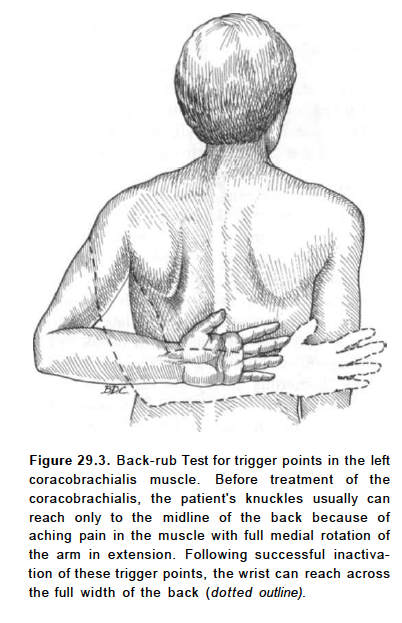 The overuse of the coracobrachialis can lead to stiffening of the muscle. Common causes of injury include chest workouts or activities where you have to press your arm very tight towards your body - e.g. work on the rings in gymnastics.[4] Symptoms of overuse or injury are pain in the arm and shoulder, radiating down to the back of the hand. In more severe cases, the musculocutaneous nerve can get trapped, causing disturbances in sensation to the skin on the radial part of the forearm and weakened flexion of the elbow, as the nerve also supplies the biceps brachii and brachialis muscle.[5]