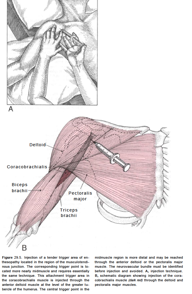 It arises from the apex of the coracoid process, in common with the short head of the biceps brachii, and from the intermuscular septum between the two muscles.