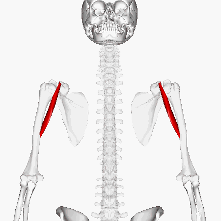 The action of the coracobrachialis is to flex and medially rotate the arm. Also, the coracobrachalis resists deviation of the arm from the frontal plane during abduction.[1] Therefore, the contraction of the coracobrachialis leads to two distinct movements at the shoulder joint. It both draws the humerus forward, causing shoulder flexion, and draws the humerus toward the torso, causing shoulder adduction. To a smaller extent, it also turns the humerus inwards, causing inward rotation.[2] Another important function of the coracobrachialis is the stabilization of the humeral head within the shoulder joint, especially when the arm is hanging freely at a person’s side.[3]