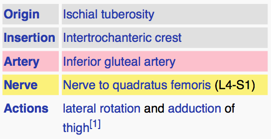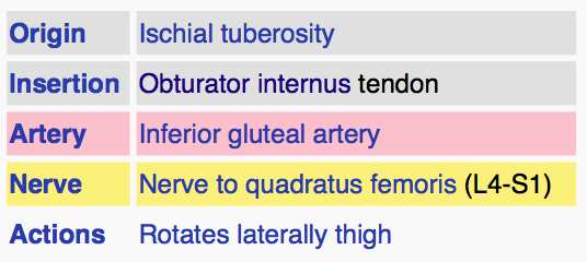 It originates on the lateral border of the ischial tuberosity of the ischium of the pelvis.[1] From there, it passes laterally to its insertion on the posterior side of the head of the femur: the quadrate tubercle on the intertrochanteric crest and along the quadrate line, the vertical line which runs downward to bisect the lesser trochanter on the medial side of the femur. Along its course, quadratus is aligned edge to edge with the inferior gemellus above and the adductor magnus below, so that its upper and lower borders run horizontal and parallel.[3] At its origin, the upper margin of the adductor magnus is separated from it by the terminal branches of the medial femoral circumflex vessels. A bursa is often found between the front of this muscle and the lesser trochanter. Sometimes absent.