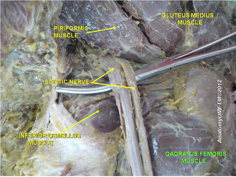 It arises from the inner surface of the antero-lateral wall of the pelvis, where it surrounds the greater part of the obturator foramen, being attached to the inferior rami of the pubisand ischium, and at the side to the inner surface of the hip bone below and behind the pelvic brim, reaching from the upper part of the greater sciatic foramen above and behind to the obturator foramen below and in front. It also arises from the pelvic surface of the obturator membrane except in the posterior part, from the tendinous arch which completes the canal for the passage of the obturator vessels and nerve, and to a slight extent from the obturator fascia, which covers the muscle. The fibers converge rapidly toward the lesser sciatic foramen, and end in four or five tendinous bands, which are found on the deep surface of the muscle; these bands are reflected at a right angle over the grooved surface of the ischium between its spine and tuberosity. The tendon inserts on the greater trochanter of the proximal femur. Obturator Internis muscle is also innervated by the nerve to obturator internis (L5, S1).