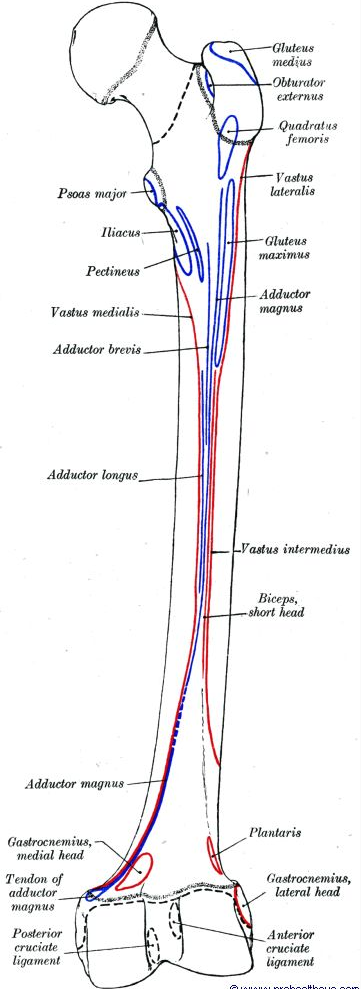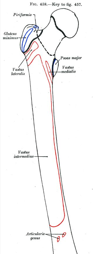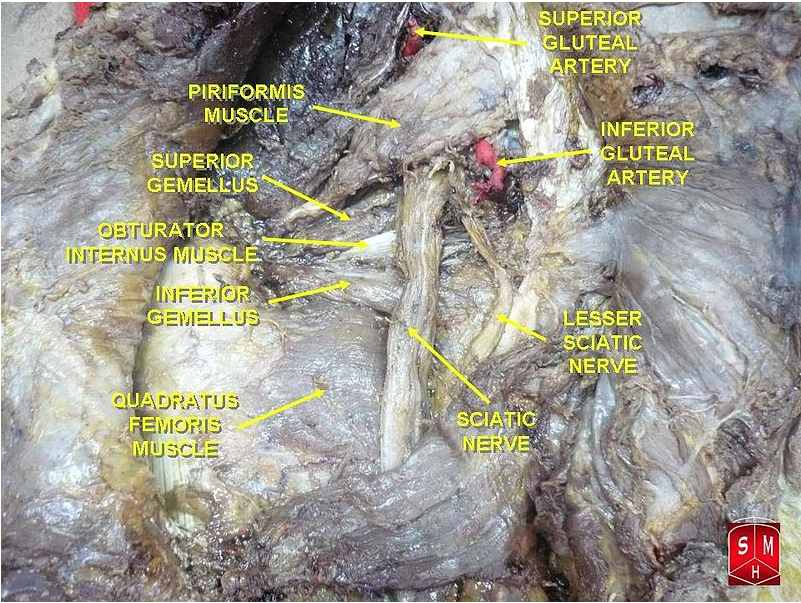 The fibers converge and pass posterolateral and upward, and end in a tendon which runs across the back of the neck of the femur and lower part of the capsule of the hip joint and is inserted into the trochanteric fossa of the femur.