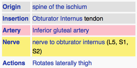 Etymology: Gemellus is the diminutive of "geminus" meaning twin, doubled or duplicated. The superior and inferior Gemellus muscles are paired and perform the same action.