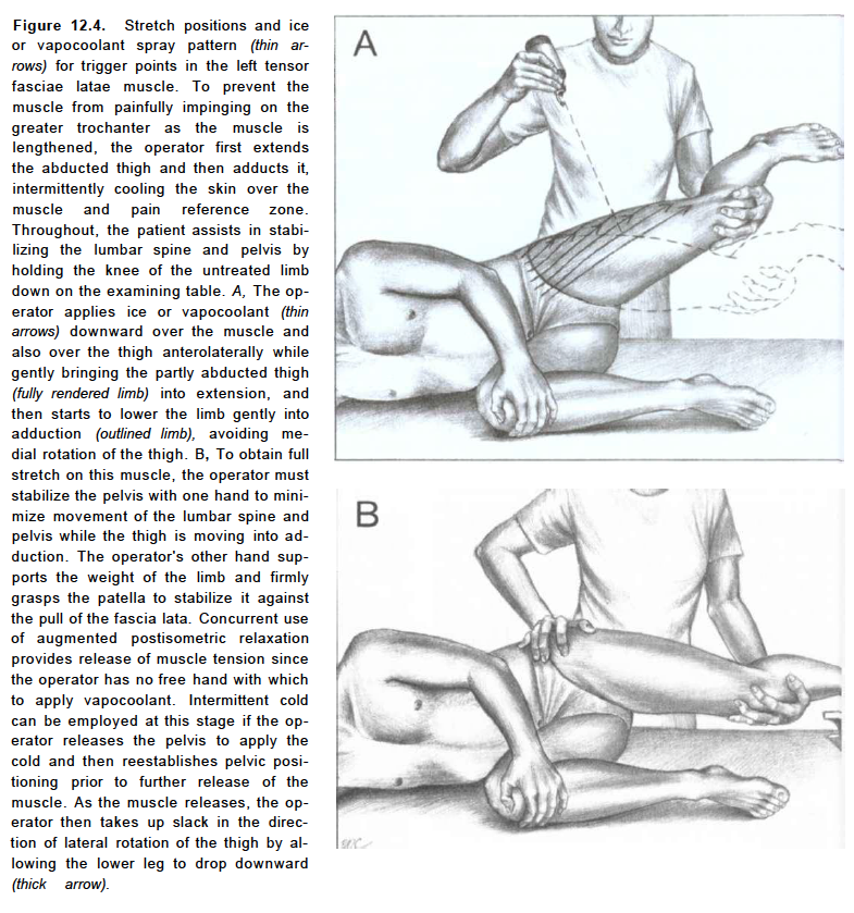 The tensor fasciae latae is a hip flexor and abductor muscle, meaning it assists in moving the hip forward and outward. Rotating the hips inward is another action the TFL muscle does. Because it's used for so many movements and is in a shortened position when seated, the TFL becomes tight easily. TFL stretches lengthen this important muscle.[3] The TFL is often involved in lateral meniscus and or knee pain/ problems. Evaluating for strain-sprain and trigger point in the TFL and then correcting with Jones and or Travell technique will significantly aid recovery and reduce pain.