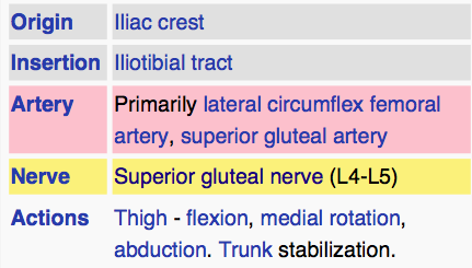 It arises from the anterior part of the outer lip of the iliac crest; from the outer surface of the anterior superior iliac spine, and part of the outer border of the notch below it, between the gluteus medius and sartorius; and from the deep surface of the fascia lata.