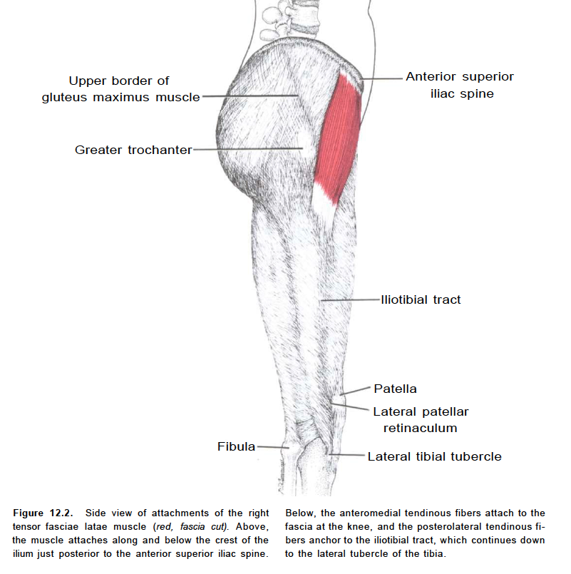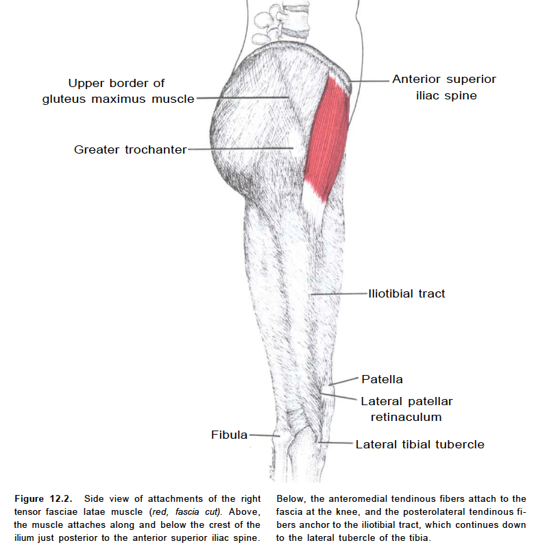 The tensor fasciae latae is a tensor of the fascia lata; continuing its action, the oblique direction of its fibers enables it to stabilize the hip in extension (assists gluteus maximus during hip extension). The fascia latae is a fibrous sheath that encircles the thigh like a subcutaneous stocking and tightly binds its muscles. On the lateral surface, it combines with the tendons of the gluteus maximus and tensor fasciae latae to form the iliotibial band, which extends from the iliac crest to the lateral condyle of the tibia.[1]