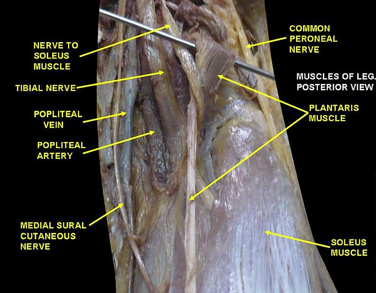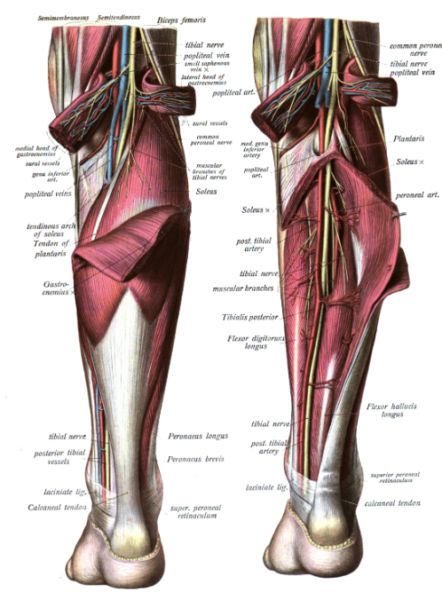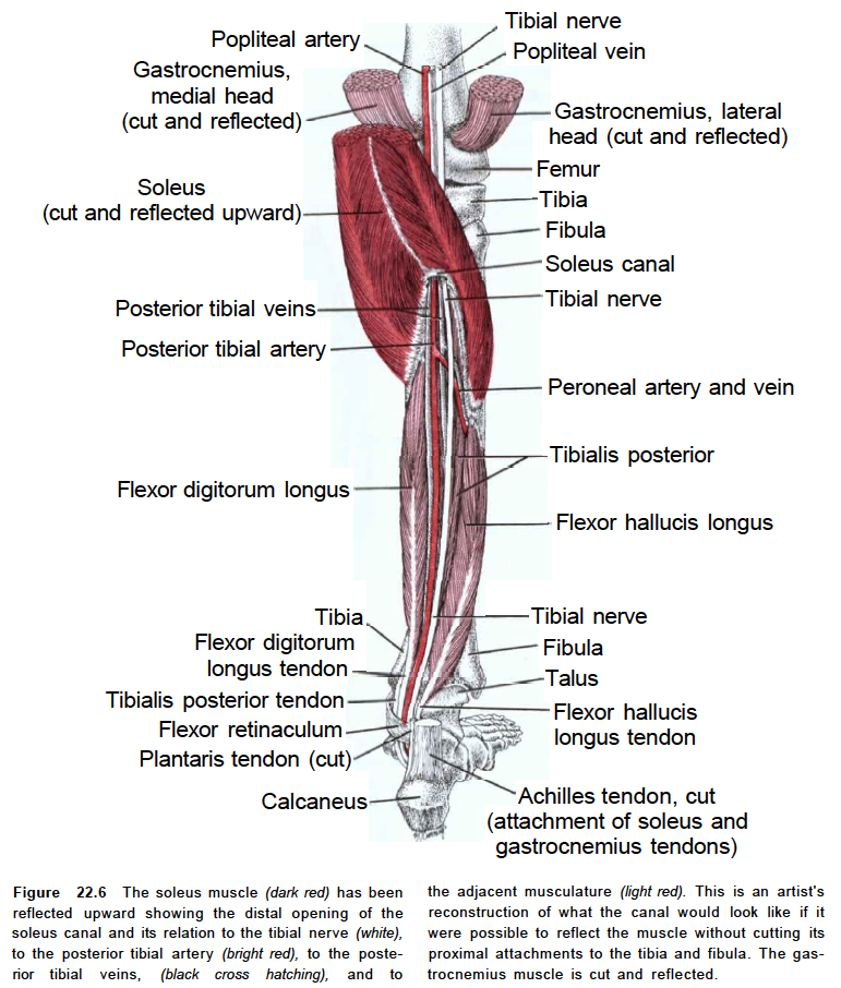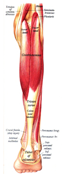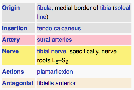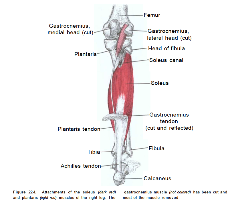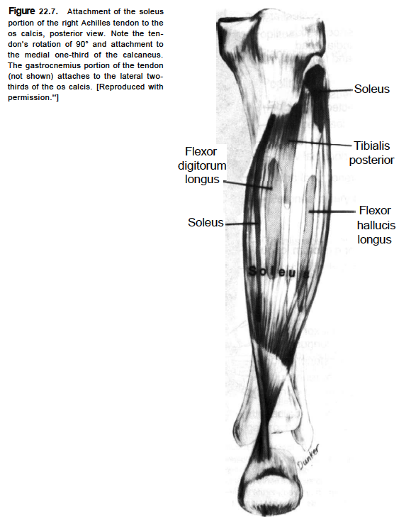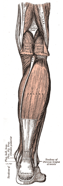 The fibers originating from the anterior surface of the anterior aponeurosis insert onto the median septum and the fibers originating from the posterior surface of the anterior aponeurosis insert onto the posterior aponeurosis.[2][3] The posterior aponeurosis and median septum join in the lower quarter of the muscle and then join with the anterior aponeuroses of the gastrocnemius muscles to form the calcaneal tendon or Achilles tendon and inserts onto the posterior surface of the calcaneus, or heel bone.