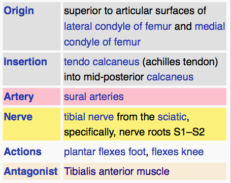 The gastrocnemius is involved in standing, walking, running and jumping. Along with the soleus muscle it forms the calf muscle. Its function is plantar flexing the foot at the ankle joint and flexing the leg at the knee joint.