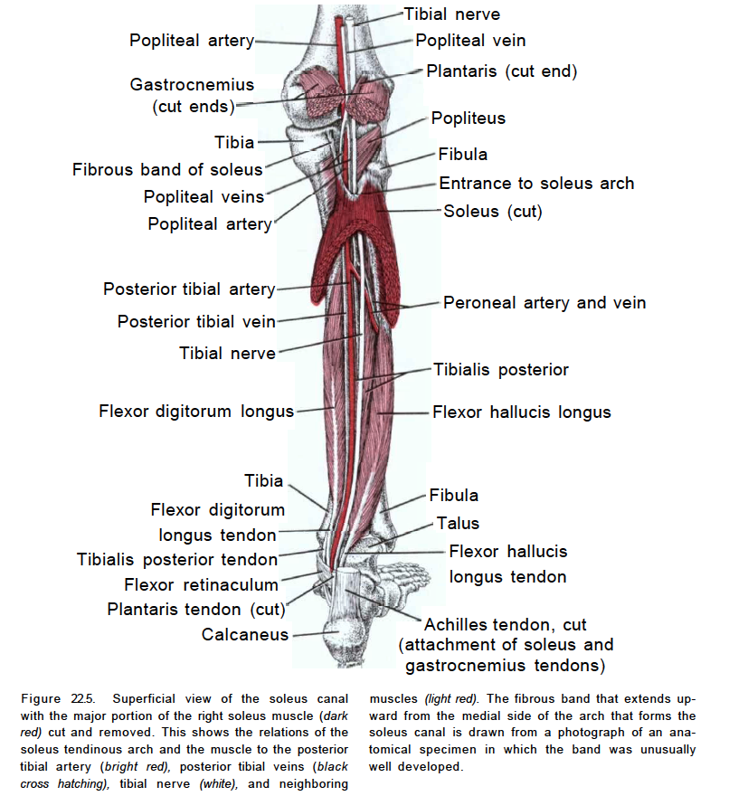 On the other side of the fascia are the tibialis posterior muscle, the flexor digitorum longus muscle, and the flexor hallucis longus muscle, along with the posterior tibial arteryand posterior tibial vein and the tibial nerve.