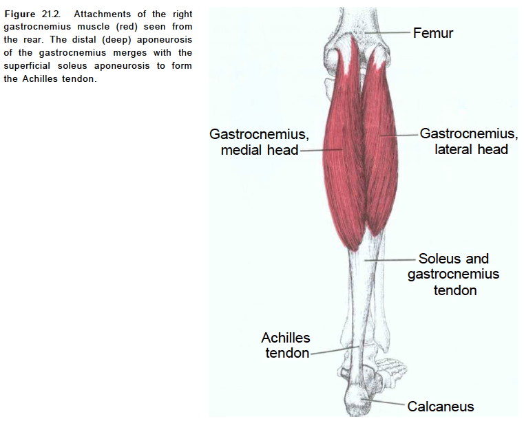 The gastrocnemius is located with the soleus in the posterior (back) compartment of the leg. The lateral head originates from the lateral condyle of the femur, while the medial head originates from the medial condyle of the femur. Its other end forms a common tendon with the soleus muscle; this tendon is known as the calcaneal tendon or Achilles Tendon and inserts onto the posterior surface of the calcaneus, or heel bone.