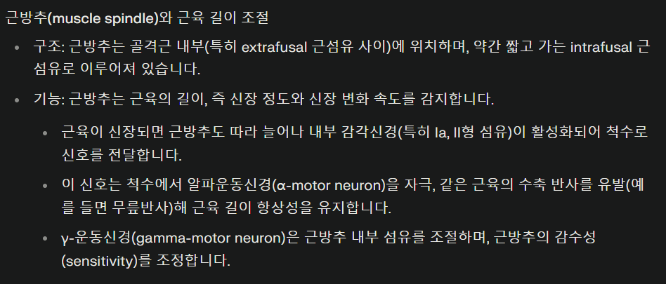 | 기능 | 근육신장, 길이변화 속도 정보 | 신장 --> 장력 감지, 조절 |
