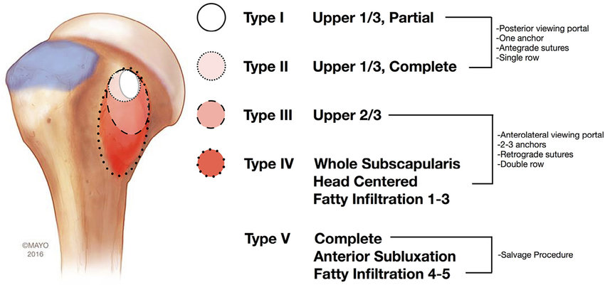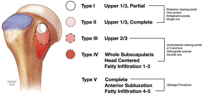 Lafosse type I and type II tears may be fixed with 1 or 2 anchors, most commonly while visualizing intra-articularly from the standard posterior portal; larger Lafosse type III and type IV tears are typically best addressed visualizing from an anterior subacromial portal and require placement of multiple anchors. Tendon mobilization for larger tears is of paramount importance. For Lafosse type V tendon tears, transfer of the pectoralis major has provided mixed results, RSA is commonly considered, and alternative tendon transfers are being developed.