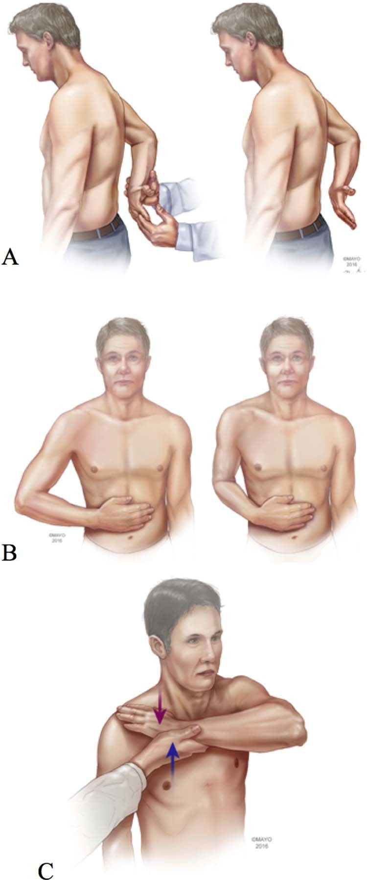 Subscapularis physical examination maneuvers. (A) Lift-off test. (B) Belly-press test. (C) Bear hug test.