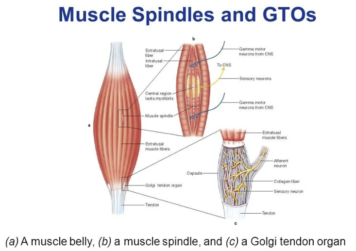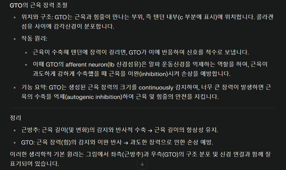 | 임상 | 원심성 근수축(근육길이 신장) 정보 --> 척수 전달 --> alpha motor neuron 활성 --> reflexive muscle contraction --> 지속적 근수축(Spasm, TrP) | 원심성 근수축으로 장력정보 --> 척수 전달 --> gamma motor neuron 억제성 활성 --> autogenic inhibition --> 근육, 건파열 보호 |