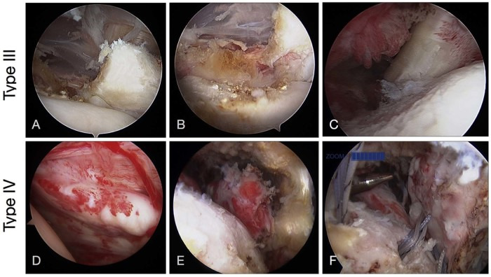 Arthroscopic fixation of type III and type IV tears. (A-C) Type III tear. Note the disruption of the superior tendinous portion in (A) and continuity of the muscle portion in (B). (C) Fixation of type III tear. (D-F) Type IV tear. (D) Before mobilization of tendon. (E) After mobilization of tendon; note how far back the tendon is retracted. (F) Suture fixation of the tendon with multiple anchors.