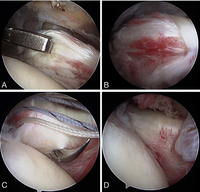 Intraoperative images of a subscapularis tear. (A) Traction on the subscapularis reveals the poor-quality tendon associated with a tear. (B) Tear in continuity seen in subscapularis tendon. (C) Intraoperative fixation of tendon with retrograde passing of sutures for horizontal mattress suture fixation. (D) Final picture of re-established rolled border.