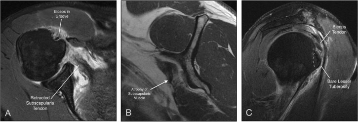Applying the 4-step magnetic resonance imaging evaluation by Adams et al.1 (A) Axial image showing the biceps tendon in the groove with an obvious retracted tear of the subscapularis tendon. (B) Sagittal image showing grade 2 fatty infiltration of the subscapularis muscle. (C) Sagittal image showing a bare lesser tuberosity.
