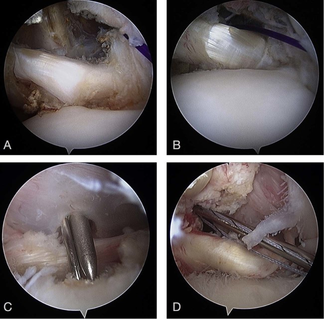 Arthroscopic fixation of type I and type II tears. (A) Type I tear. (B) Fixation of type I tear. (C) Type II tear. (D) Fixation of type II tear.