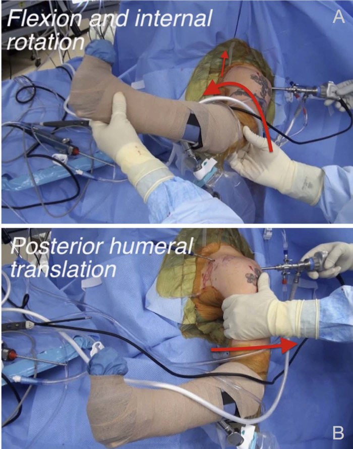 Manipulation methods for better arthroscopic subscapularis visualization. (A) Flexion and internal rotation of affected extremity. (B) “Posterior lever push,” whereby a posteriorly directed force is placed on the proximal humerus.