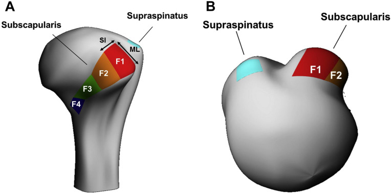 견갑하근은 견갑골 전면을 따라 위치한 견갑하근과에서 기시합니다. 근육 단면적 기준으로 견갑하근은 회전근개 근육량의 53%를 차지하며, 이는 나머지 세 근육을 모두 합친 것보다 많다.35 4~6개의 건 슬립이 상부에서 합쳐져 견갑하건이 소결절에 부착되는 굴곡된 상부 경계를 형성한다.12 여러 연구자들이 견갑하근의 부착면(footprint) 면적에 대해 보고했다. D'Addesi 등은 25×18mm의 삽입 발자국을 보고했으며, Arai 등은 40.7×12.5mm의 발자국을 보고했고, Yoo 등은 총 51.5×10.7mm의 4개 하부 견갑하근 삽입면을 기술했으며, 첫 번째 면이 전체 발자국의 34%를 차지한다고 기술했습니다.5, 14, 66 이러한 측정값의 차이는 견갑하근 힘줄의 4개 부착면 전체가 불완전하게 표현되었기 때문이다.66
