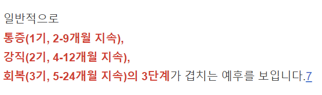 회복(3기, 5-24개월 지속)의 3단계가 겹치는 예후를 보입니다.7