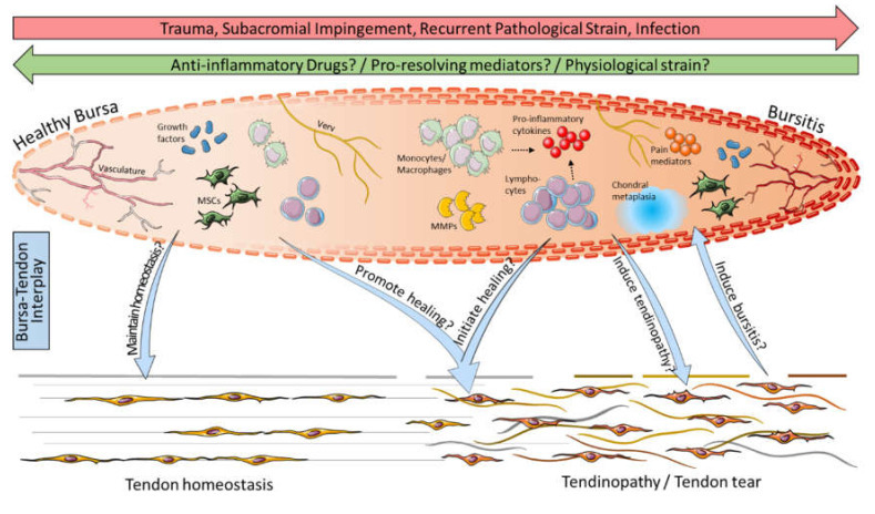 Possible bursa–tendon interaction: Inflammation through trauma, impingement, recurrent pathological strain, or infection leads to the development of bursitis, whereas bursitis might be cured by anti-inflammatory drugs, pro-resolving mediators, and/or physiological strain. Bursitis is characterized in particular by the presence of immune cells such as monocytes/macrophages and lymphocytes (NK cells, B cells, and T cells), pro-inflammatory cytokines (e.g., SDF-1, IL-1β, and TNF-α), matrix metalloproteinases (MMPs), pain mediators (e.g., COX-2, NGF, and substance P), and chondral metaplasia. Compared to that, healthy bursae contain lower numbers of immune cells and predominate by growth factors and mesenchymal stem cells (MSCs) and, thus, might maintain tendon homeostasis. In bursa–tendon interplay it is hypothesized that growth factors and MSCs in the bursa can promote the healing of tendinopathies, including rotator cuff tears, and it has to be elucidated if pro-inflammatory cells and mediators might help to initiate healing cascades at the tendon rupture side. Vice versa, it is still debatable if bursitis is the cause or consequence of pathological conditions in the tendon. This graphic was created with images from Servier Medical Art.