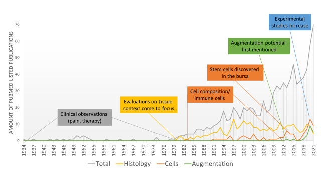 Overview of historical steps towards increased experimental research around the subacromial bursa: number of PubMed listed publications from 1934 to 2021 mentioning subacromial bursa OR subacromial bursitis (total) combined with the search terms “Histology”, “Cells”, and “Augmentation”.