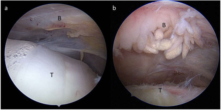 Arthroscopic view from a posterior portal during arthroscopy of a right shoulder showing (a) a normal subacromial/subdeltoid bursa (B) and healthy tendon (T) and (b) a severe hypertrophic subacromial bursitis (B) and fraying of the supraspinatus tendon (T).