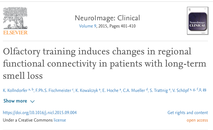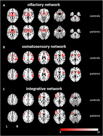 The main aim of the study was to investigate the neural activation induced by chemosensory stimulation in patients with smell loss before and after smell training, compared with healthy controls. We were able to show that, compared to healthy controls, the networks processing chemosensory stimuli in anosmics are altered in their functional connectivity compared to healthy controls. After successful olfactory training for 12 weeks, which resulted in better sensitivity to detect odors, patients with no formal sense of smell showed extended functional connectivity in chemosensory processing networks.