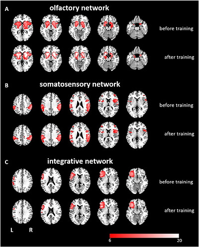 In this study, we were able to show that the functional connectivity of olfactory-related networks may be reorganized by training. After a 12-week training period, the number of connections to the seed region of the network increased, especially in the olfactory and the integrative networks. After the training, some functional connections in the olfactory network were re-established, among them functional connections to the anterior entorhinal cortex, the inferior prefrontal gyrus, and the primary somatosensory cortex. This finding is of particular interest, as it suggests that the olfactory training induces the reconstruction of the olfactory-specific processing network. However, during this time, no significant differences in the spatial distribution of the network patterns were detected. Training-induced behavioral improvement in olfactory performance has also been observed in patients with reduced olfactory function (hyposmia), and in healthy controls. Thus, future studies may shed light on the potential functional connectivity in patients with hyposmia.