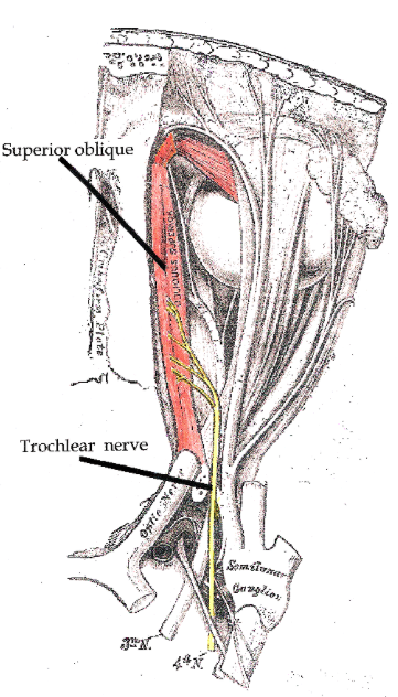 It enters the cavernous sinus where it runs anteriorly above the abducens nerve and ophthalmic branch of the trigeminal nerve. Here in the cavernous sinus, a few sympathetic fibers join the trochlear nerve with the possibility of some sensory fibers from the trigeminal nerve. The nerve then enters the orbit through the superior orbital fissure and continues to extend anteriorly to the superior oblique muscle.[1][3] The superior orbital fissure is also the nerve pathway for cranial nerves III, VI, and V and is vulnerable to shearing forces in the setting of trauma.
