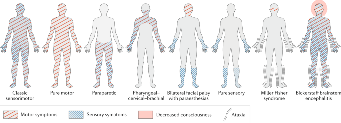 Guillain–Barré syndrome (GBS) is an inflammatory disease of the PNS and is the most common cause of acute flaccid paralysis, with an annual global incidence of approximately 1–2 per 100,000 person-years1. GBS occurs more frequently in males than in females and the incidence increases with age, although all age groups can be affected1. Patients with GBS typically present with weakness and sensory signs in the legs that progress to the arms and cranial muscles, although the clinical presentation of the disease is heterogeneous and several distinct clinical variants exist. Diagnosis of GBS is based on the patient history and neurological, electrophysiological and cerebrospinal fluid (CSF) examinations2,3,4. Other diseases that have a similar clinical picture to GBS must be ruled out4. Electrophysiological studies provide evidence of PNS dysfunction and can distinguish between the subtypes of GBS: acute inflammatory demyelinating polyradiculoneuropathy (AIDP), acute motor axonal neuropathy (AMAN) and acute motor sensory axonal neuropathy (AMSAN)5. Disease progression can be rapid, and most patients with GBS reach their maximum disability within 2 weeks. About 20% of patients with GBS develop respiratory failure and require mechanical ventilation. Cardiac arrhythmias and blood pressure instability can occur owing to involvement of the autonomic nervous system6. This involvement of the autonomic nervous system contributes to mortality, which is estimated at 3–10% for patients with GBS even with the best medical care available7,8,9. After the initial progressive phase, patients with GBS reach a plateau phase that can last from days to weeks or months, after which they start to recover, and 60–80% of patients with GBS are able to walk independently 6 months after disease onset, with or without treatment10,11. GBS is a monophasic illness, although some patients can deteriorate after first stabilizing or improving on therapy — a phenomenon that is referred to as a treatment-related fluctuation (TRF). Relapses of GBS can occur in 2–5% of patients10,12,13,14,15.