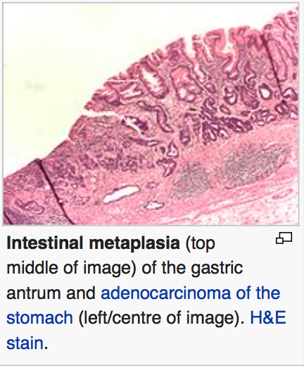 장상피화생은 위, 식도 상피세포의 변질형성임. 위에서 헬레코박터파일로리균에 의해 만성염증에 의해서 야기되고, 위식도역류질환( Gastroesophageal reflux disease)에서 변질형성의 원발개시자로 관찰되고 이어서 선암이 됨. 초기에 변질형성된 상피세포는 소장 lining과 유사하고, 이후 변하여 결장의 lining과 유사함. 그것은 globet세포의 발현과 CCX2와 같은 유전자 전사인자에 의해 특징지워짐.