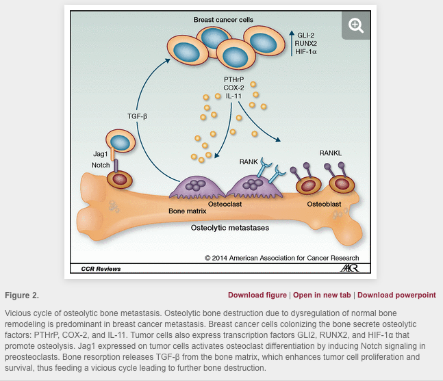 Vicious cycle of osteolytic bone metastasis. Osteolytic bone destruction due to dysregulation of normal bone remodeling is predominant in breast cancer metastasis. Breast cancer cells colonizing the bone secrete osteolytic factors: PTHrP, COX-2, and IL-11. Tumor cells also express transcription factors GLI2, RUNX2, and HIF-1α that promote osteolysis. Jag1 expressed on tumor cells activates osteoclast differentiation by inducing Notch signaling in preosteoclasts. Bone resorption releases TGF-β from the bone matrix, which enhances tumor cell proliferation and survival, thus feeding a vicious cycle leading to further bone destruction.
