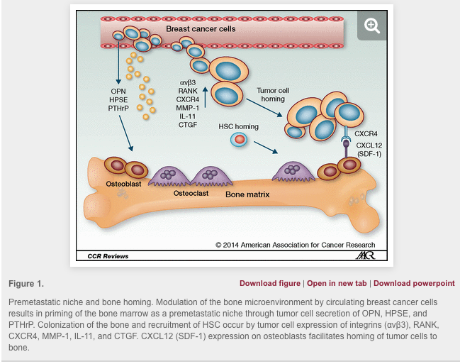 The hematopoietic system plays an important role in development of the premetastatic niche. The bone marrow may serve as a protective milieu for dormant tumor cells to resist chemotherapeutic attack, and tumor cells may use the same physiologic mechanisms as those used by hematopoietic stem cells (HSC) homing to bone (10, 11). In the premetastatic niche, the invading tumor cells prime the stroma by production of factors that elicit responses in cells of the bone microenvironment and make it conducive to tumor colonization and growth (2). In addition, bone resorption also regulates HSC homing (12). Factors derived from tumor cells include osteopontin (OPN), which promotes bone marrow cell migration and tumor cell proliferation (13, 14); heparanase (HPSE), which acts in the extracellular matrix to reduce heparin sulfate chain length leading to increased bone resorption (15); and parathyroid hormone-related protein (PTHrP), which promotes bone resorption (16) and may also enhance production of bone marrow chemokines such as C-C motif ligand 2 (17). Recently, it has also been shown that the sympathetic nervous system is also capable of stimulating stromal cells, thus promoting breast cancer bone metastasis (18).