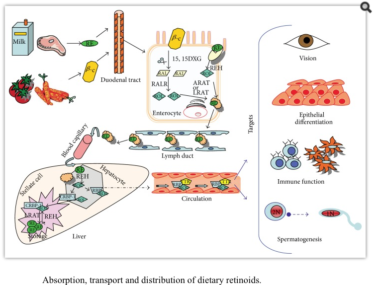 Vitamin A can be acquired from the diet either as preformed vitamin A (primarily as retinyl ester, retinol, and in much smaller amount as retinoic acid) or provitamin A carotenoids (Figure 1). Dietary retinyl esters are converted to retinol within the lumen of the small intestine or the intestinal mucosa and then reesterified to form retinyl ester (RE) within the enterocyte [1]. Provitamin A carotenoids, absorbed by the mucosal cells, are converted first to retinaldehyde and then to retinol [1]. After secretion of the nascent chylomicrons into the lymphatic system, the bulk of dietary vitamin A is taken up by hepatocytes and hydrolyzed again. The free retinol binds the epididymal retinoic acid binding protein (ERABP) and the retinol binding protein (RBP) [2] and into plasma transthyretin. Free retinol can be transferred to hepatic stellate cells for storage. Hepatocytes and hepatic stellate cells are very rich in retinyl ester hydrolases and in cellular retinol binding protein type 1 (CRBP-1). CRBP-1 is necessary to solubilize retinol in the aqueous environment of the cell [1].