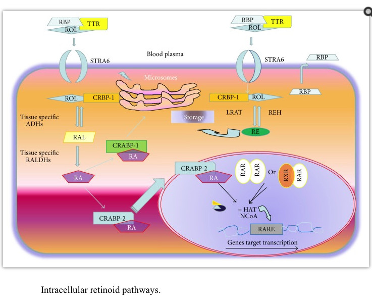 A cell-surface receptor named stimulated by retinoic acid 6 (STRA6) mediates vitamin A uptake from RBP [3]. Intracellular retinoid bioavailability is regulated by the presence of specific cytoplasmic retinol and retinoic acid binding proteins, CRBPs and CRABPs (Figure 2). In the cytoplasm vitamin A and derivatives are bound to cytoplasmic proteins: cellular retinol binding proteins (CRBPs) which comprised four isoforms, CRBP-1 and CRBP-2 and CRBP-3 and CRBP-4. CRBP-1, are the most represented isoform in many tissues. Cellular retinoic acid binding proteins (CRABPs) comprised two isoforms, CRABP-1 and CRABP-2. CRBPs specifically bind retinol, while CRABPs and well-characterized members of the fatty acid binding proteins (FABPs) bind retinoic acid (RA). These proteins control the availability of ligands and determine the physiological response of cells and tissues to vitamin A [4]. Cellular retinoic acid binding proteins may regulate the interactions between retinoic acids and their nuclear receptors by regulating the concentration of present retinoic acids [5]. Retinoids can activate gene expression by specific nuclear retinoid acid receptors. Two distinct classes of nuclear proteins, the retinoic acid receptors (RARs), and the retinoid X receptors (RXRs) have been identified. Each class consists ofα, β, and γsubtypes. RARs and RXRs form either homodimers or heterodimers and function as transacting nuclear transcriptional factors [6]. RAR can be activated by both all-trans and 9-cis RA, whereas RXR is only activated by 9-cis-RA. Heterodimerization of retinoid receptors is essential for the biological activity, although it should be noted that RXRs can heterodimerize with numerous other non-RA associated nuclear receptors to mediate alternative signaling pathways. In the presence of retinoids, nuclear receptors bind to their respective response elements RAREs and RXREs in regulatory regions of target genes and modulate gene transcription [7].