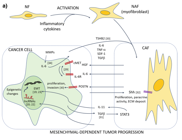 Here, we dissect the most recent identified mechanisms underlying CAF-mediated control of tumor progression and therapy resistance, which include induction of the epithelial-to-mesenchymal transition (EMT), activation of survival pathways or stemness-related programs and metabolic reprogramming in tumor cells. Importantly, the recently unveiled heterogeneity in CAFs claims tailored therapeutic efforts aimed at eradicating the specific subset facilitating tumor progression, therapy resistance and relapse. However, despite the large amount of pre-clinical data, much effort is still needed to translate CAF-directed anti-cancer strategies from the bench to the clinic.
