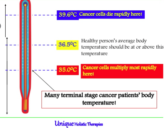 저체온을 형성하는 암세포는 열에 약한 특성을 가지고 있음. 암세포는 언제나 우리 몸 깊은 곳의 체온을 낮추려함. 암세포는 35도체온에서 가장 잘 활성화함. 많은 암 환자의 체온이 36.6-37보다 낮은 35도대까지 떨어지는 것은 우연이 아님. 체온이 낮으면 면역력이 떨어짐. 기초체온 상승은 심부체온 상승의 바로미터이고 면역력 증진의 필수임.