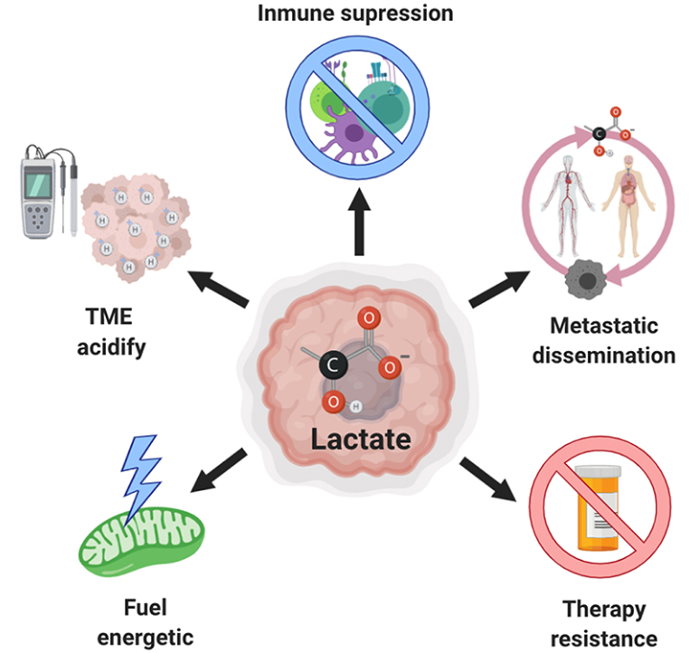 Tumor cells must generate sufficient ATP and biosynthetic precursors in order to maintain cell proliferation requirements. Otto Warburg showed that tumor cells uptake high amounts of glucose producing large volumes of lactate even in the presence of oxygen, this process is known as “Warburg effect or aerobic glycolysis.” As a consequence of such amounts of lactate there is an acidification of the extracellular pH in tumor microenvironment, ranging between 6.0 and 6.5. This acidosis favors processes such as metastasis, angiogenesis and more importantly, immunosuppression, which has been associated to a worse clinical prognosis. Thus, lactate should be thought as an important oncometabolite in the metabolic reprogramming of cancer. In this review, we summarized the role of lactate in regulating metabolic microenvironment of cancer and discuss its relevance in the up-regulation of the enzymes lactate dehydrogenase (LDH) and monocarboxilate transporters (MCTs) in tumors. The goal of this review is to expose that lactate is not only a secondary product of cellular metabolic waste of tumor cells, but also a key molecule involved in carcinogenesis as well as in tumor immune evasion. Finally, the possible targeting of lactate production in cancer treatment is discussed.
