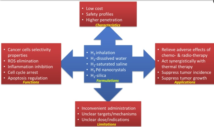 Gas signaling molecules (GSMs), composed of oxygen, carbon monoxide, nitric oxide, hydrogen sulfide, etc., play critical roles in regulating signal transduction and cellular homeostasis. Interestingly, through various administrations, these molecules also exhibit potential in cancer treatment. Recently, hydrogen gas (formula: H2) emerges as another GSM which possesses multiple bioactivities, including anti-inflammation, anti-reactive oxygen species, and anti-cancer. Growing evidence has shown that hydrogen gas can either alleviate the side effects caused by conventional chemotherapeutics, or suppress the growth of cancer cells and xenograft tumor, suggesting its broad potent application in clinical therapy. In the current review, we summarize these studies and discuss the underlying mechanisms. The application of hydrogen gas in cancer treatment is still in its nascent stage, further mechanistic study and the development of portable instruments are warranted.