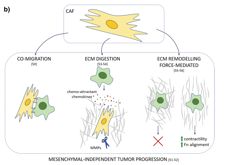 In the last decades, the role of the microenvironment in tumor progression and therapeutic outcome has gained increasing attention. Cancer-associated fibroblasts (CAFs) have emerged as key players among stromal cells, owing to their abundance in most solid tumors and their diverse tumor-restraining/promoting roles. The interplay between tumor cells and neighboring CAFs takes place by both paracrine signals (cytokines, exosomes and metabolites) or by the multifaceted functions of the surrounding extracellular matrix.